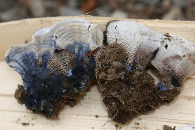 Das Bein ist pyramidenförmig, uneben, faserig-starr. Die Farbe ist blau-braun. Die Höhe beträgt 1 bis 5 cm, der Durchmesser 2 bis 9 cm. Die Oberfläche ist samtig und mit weichen Flusen bedeckt. Beim Drücken ändert sich die Farbe in eine dunklere. Das Hymenophor ist nadelförmig und sieht aus wie ein Dickicht von Meerespolypen. Stacheln sind oft lokalisiert, bis zu 0,5 cm lang, weiß oder grau, mit dem Alter buffy-beige, braun. Das Sporenpulver ist braun.