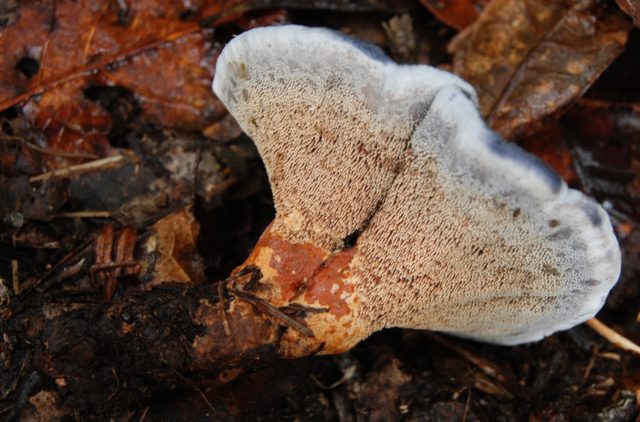 Hydnellum caeruleum. Ungenießbar. Sein Fleisch ist bläulich-grau. Es kann durch den leuchtend orangefarbenen Stiel junger Pilze unterschieden werden.