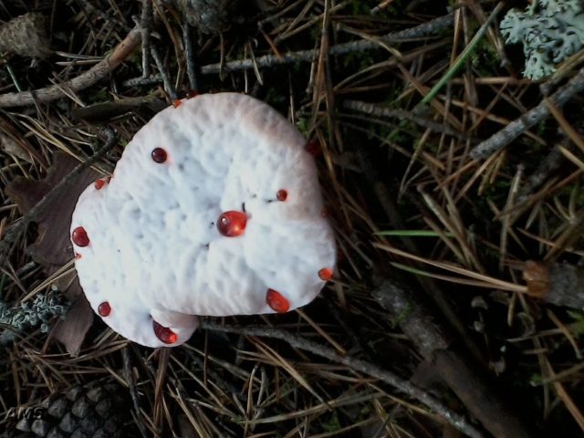 Hydnellum Peka. Ungenießbar (einige Quellen behaupten, giftig zu sein). Unterscheidet sich in blutroten Safttropfen über die gesamte Oberfläche des Fruchtkörpers. Kann sich von den Körpern von Insekten ernähren, die in klebrigem Saft gefangen sind.