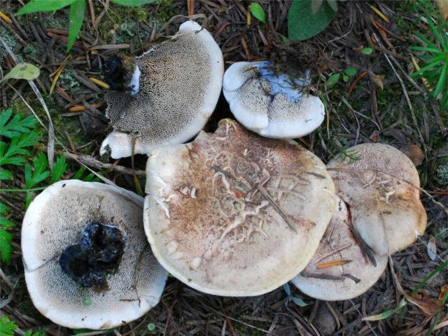 Die Oberfläche ist samtig-kurz weichhaarig, matt. Die Farbe junger Pilze ist schneeweiß und wechselt dann zu einem schmutzigen Grau mit braunbraunen oder beigen Flecken in den Vertiefungen. Bei erwachsenen Exemplaren hat der mittlere Teil eine kaffeemilchige, beige-braune, braun-rote Farbe und an den Rändern eine weiß-graue Kante.