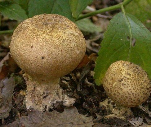 - Gepunkteter Regenmantel - hat einen birnenförmigen Fruchtkörper von olivgelber Farbe mit einer mit Dornen bedeckten Haut. Das Fleisch junger Exemplare ist weißlich, bei reifen ist es lila.