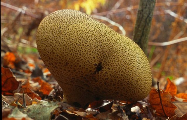 - Warty Pseudo-Regenmantel - hat einen knollenförmigen Fruchtkörper mit einem Durchmesser von bis zu 5 cm. Das dichte weiße Fruchtfleisch hat gelbe Streifen und nimmt beim Reifen eine braune oder olivgrüne Farbe an. Ein reifer Pseudo-Regenmantel ist im Gegensatz zu einem riesigen Dickkopf nicht staubig.