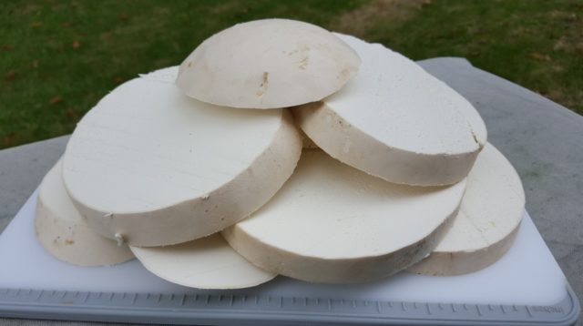Damit die Pilze gut gebraten sind und in der Mitte nicht roh bleiben, sollte die Dicke der Scheiben 0,5 bis 0,7 cm nicht überschreiten.