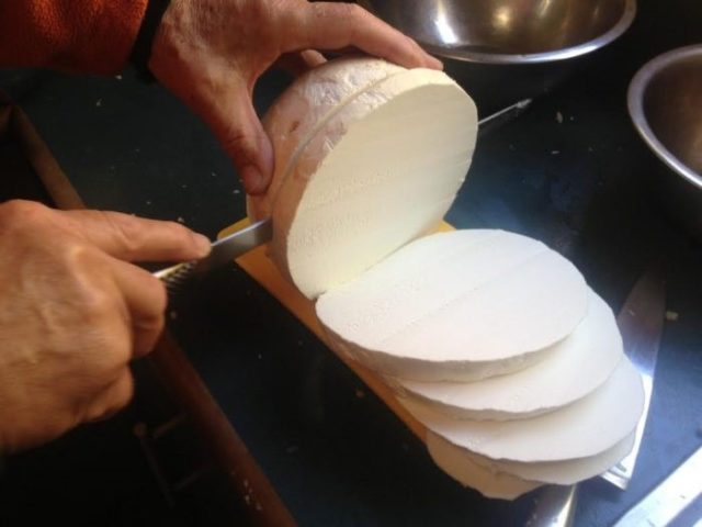 - Schneiden Sie das Fruchtfleisch der Regenmäntel so ab, dass die Dicke der Scheibe 0,5 cm nicht überschreitet.