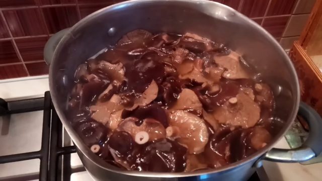 - Salzlösung aus Wasser und Salz vorbereiten. Kochen Sie es, geben Sie die Pilze hinein und kochen Sie es etwa 15 Minuten lang.