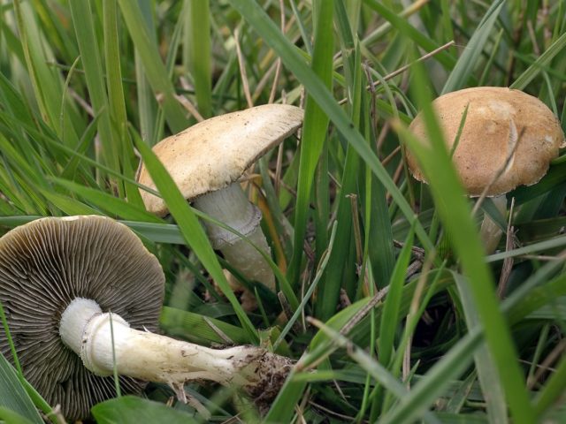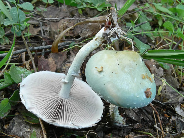 Sie erkennen junge Pilze an einem klaren Tuberkel in der Mitte der Kappe und an den Resten einer Decke an den Rändern. Die Platten auf der Kappe sind graugrün, mit zunehmendem Alter nehmen sie einen dunkelbraunen oder sogar lila Farbton an und die Ränder des Hymenophors bleiben weiß.
