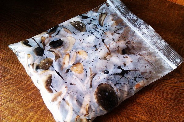 Nach dem vollständigen Abkühlen werden die getrockneten Fruchtkörper in einer solchen Menge in Beuteln ausgelegt, dass sie gleichzeitig verwendet werden können, da es unerwünscht ist, das aufgetaute Produkt wieder in den Gefrierschrank zu stellen.