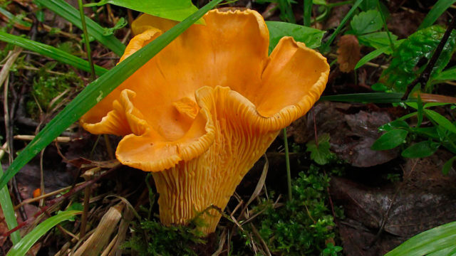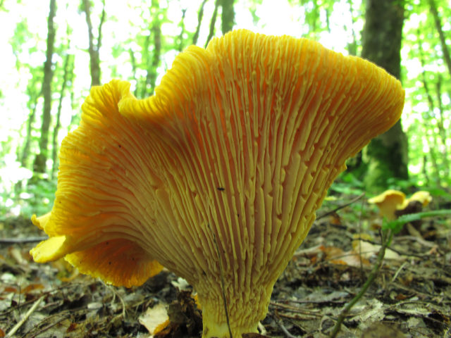 Ein weiteres Merkmal von Pfifferlingen ist ein gefaltetes Hymenophor (ein Teil eines Obstbaums, der eine sporentragende Schicht trägt). Es wird von flachen Platten gebildet und läuft bis zum Bein hinunter.