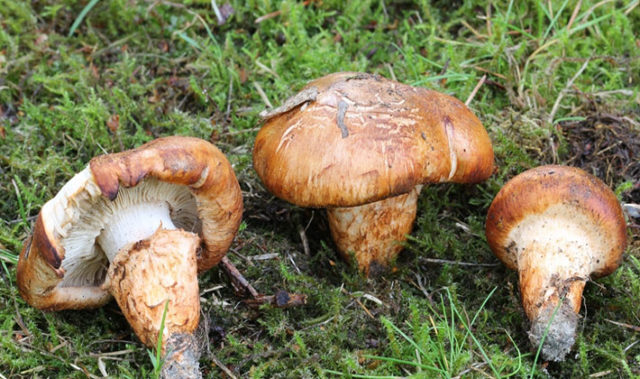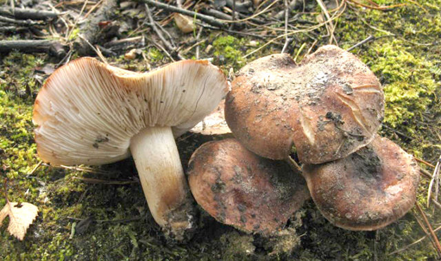 - Reihe weißbraun... Die Kappe ist schleimig, rotbraun, abgeflacht mit einem Tuberkel in der Mitte und gewellten Rändern. Es gibt merkliche dunkle Adern auf der Oberfläche und der Rand ist blass. Das Bein ist rotbraun, samtig mit einem weißen Fleck. Das Fruchtfleisch ist weiß mit einem charakteristischen Mehlgeruch.