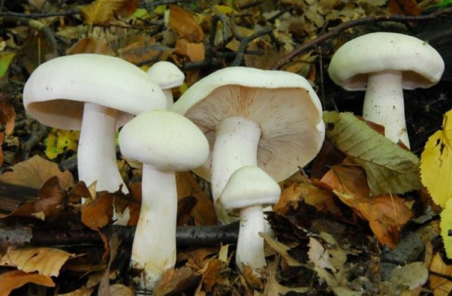 - Reihe weiß... Es zeichnet sich durch eine weiße Farbe des Fruchtkörpers aus. Seltener gibt es leicht gelblich-weiße Reihen. Der offene Hut hat eine glatte, samtige Oberfläche. Der zylindrische Stiel ist leicht gebogen. Eine Besonderheit des Pilzes ist das Fruchtfleisch mit einem stechenden Rettichgeruch, der in der Pause rosa wird.