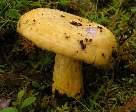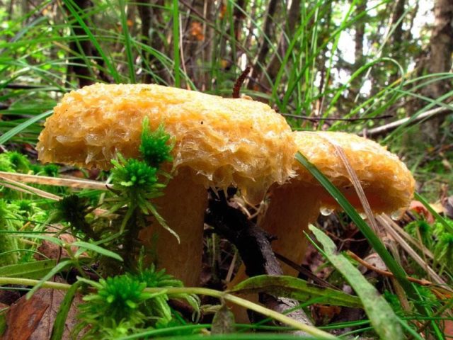 Die gelbe Ladung ist sehr groß. Wenn die Höhe des Beins der des blauen entspricht, kann die gelbe Kappe bis zu 25 cm groß werden. In jungen Jahren ist sie konvex, richtet sich später auf und wird im reifen Gestrüpp trichterförmig. Die Haut kann glatt oder wollig sein. In der zweiten Version sieht der gelbe Klumpen wirklich wie ein blauer aus.Bei Regenwetter ist die Kappe schleimig, bei trockenem Wetter klebrig. An der Fraktur tritt Milchsaft auf, der in der Luft grau-gelb wird.