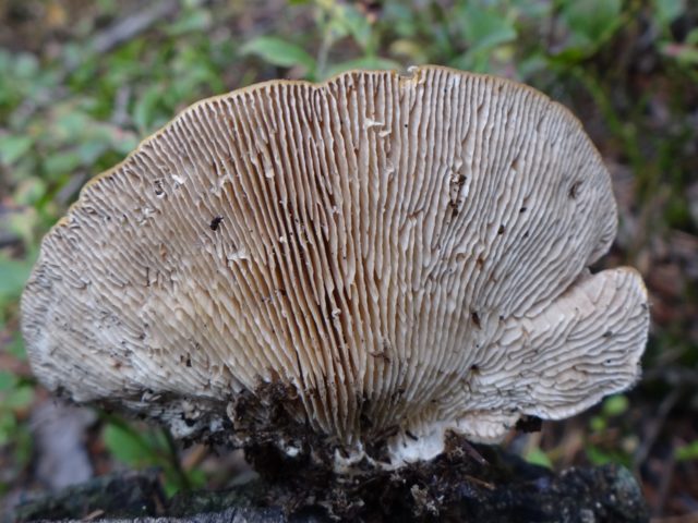 Der Fruchtkörper dieses Exemplars wird in Form einer Kappe ohne Stiel dargestellt. Die Kappe ist dünn, halbrosett mit scharfen Kanten, ihre Größe variiert zwischen 2 und 10 cm im Durchmesser. Die Oberfläche ist in jungen Jahren mit einer samtigen, haarigen oder filzigen Kante von weißlicher Farbe und in reifem Alter mit Grau oder Creme bedeckt. Es ist in konzentrische Zonen mit helleren Rändern unterteilt, weißlich, gelblich-ocker, graubraun oder braun. Sehr oft ist bei alten Pilzen die Pubertät mit bunten Algen bedeckt. Auf der Unterseite der Kappe befinden sich Platten, die sich stark verzweigen und miteinander verflechten. In der Anfangsphase der Reifung sind sie weiß gefärbt, nach einer Weile werden sie hellcremefarben oder gelb-ockerfarben. Die Sporen sind zylindrisch, dünnwandig und farblos.