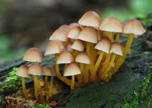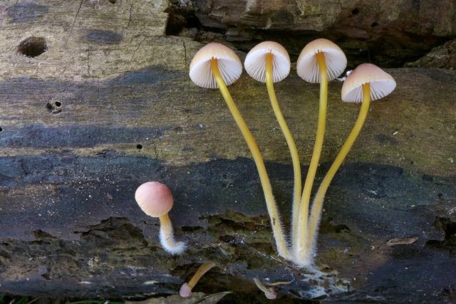 Die Farbe ist ungleichmäßig, die Kanten sind deutlich heller als die Mitte der Kappe. Der Pilz kann buffy gelb, tief orange, blassrosa, cremig beige, rotbraun oder bräunlich gelb sein. Die Oberfläche ist trocken, matt, glatt. Die Kante ist fein gezähnt, leicht gesäumt, manchmal gibt es radiale Risse. Das Fruchtfleisch ist transparent-dünn, die Narben der Platten leuchten durch. Spröde, weiße, hat einen charakteristischen unangenehmen Geruch von Harnstoff oder Bleichmittel. Die überwachsene Rene mycena hat ein Fruchtfleisch mit einem reichhaltigen stickstoff-seltenen Geruch, ihr Geschmack ist süßlich-neutral.