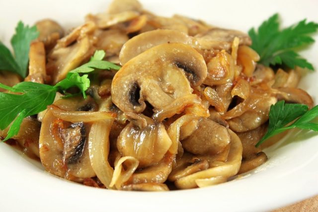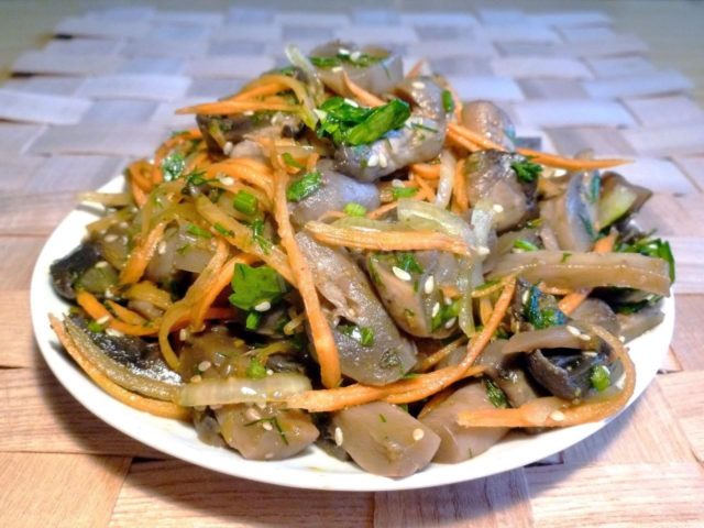 Pilze müssen sorgfältig von der Schleimhaut getrennt und gekocht werden. Danach sollten die Fruchtkörper gebraten werden und gehackte Zwiebeln und koreanische Karotten hinzugefügt werden. Das Gericht mit Olivenöl würzen.