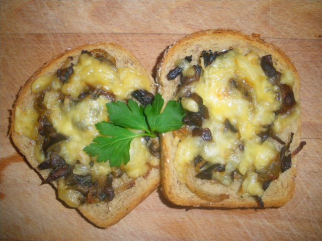 - Pilze werden auf Brot gelegt, mit geriebenem Käse und fein gehackten Kräutern bestreut.