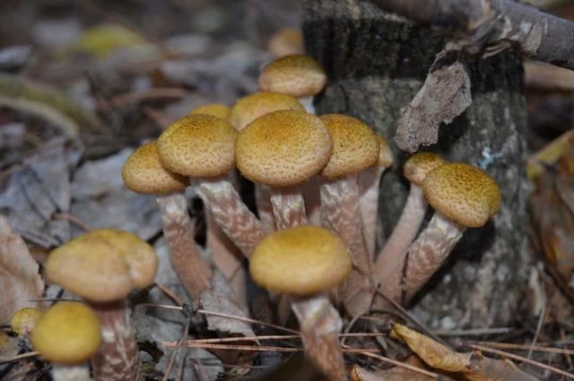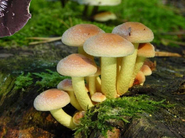 - Herbsthonig-Agaric - Die Kappe bei erwachsenen Exemplaren hat einen Durchmesser von 15 cm und die Farbe der weichen Töne reicht von grau-gelb bis gelb-braun. Das Fruchtfleisch ist angenehm im Geschmack und Geruch. Im Gegensatz zum dickbeinigen Honigpilz kommt diese Art sowohl auf lebendem als auch auf verrottetem Holz vor. Essbar, aber es gibt Kontroversen über seinen Geschmack, und in westlichen Ländern wird es allgemein als eine Art mit geringem Wert in Bezug auf das Essen angesehen. Auf dem Foto sind herbstliche geschwollene Pilze dargestellt: