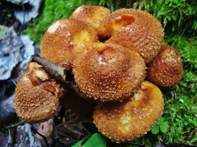 Es ist ein dunkelbrauner Pilz mit einem dicken, kurzen Stiel und einer schuppigen Kappenoberfläche.