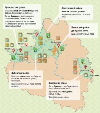 Honigpilze in der Region Tula können in jedem Gebiet gesammelt werden, in dem es Mischwälder gibt. Das Gebiet (mit Ausnahme der Vororte) ist ökologisch sauber und hat fruchtbaren Boden, sodass die Pilzsammlung unbegrenzt ist. Orte, die bei Pilzsammlern beliebt sind und an denen alle Arten wachsen: