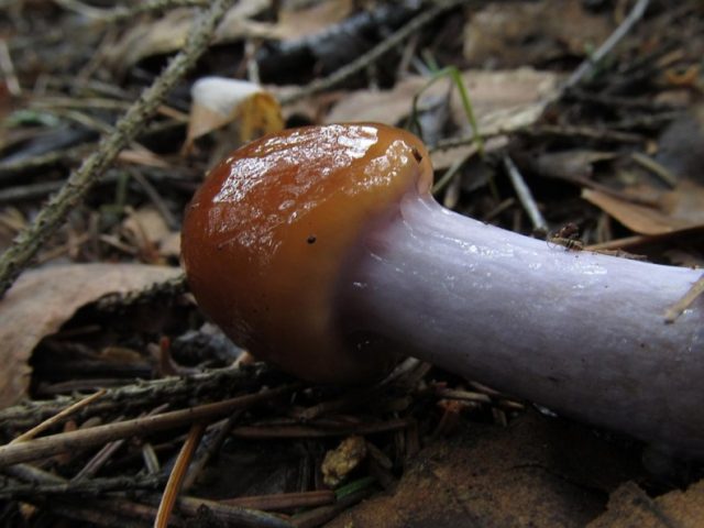 In jungen Jahren hat dieser Vertreter der Pilzfamilie einen halbkugelförmigen Hut von kastanienbrauner oder hellbrauner Farbe. Sein Schatten in der Mitte ist dunkler als an den Rändern. Im Erwachsenenalter wird es konvex und nimmt später eine fast flache, ausgestreckte Form an. Die Oberfläche der Kappe ist feucht, glänzend, schleimig. Braune, braune anhaftende Platten werden mit mittlerer Frequenz platziert. Der Durchmesser beträgt 5 bis 10 cm.