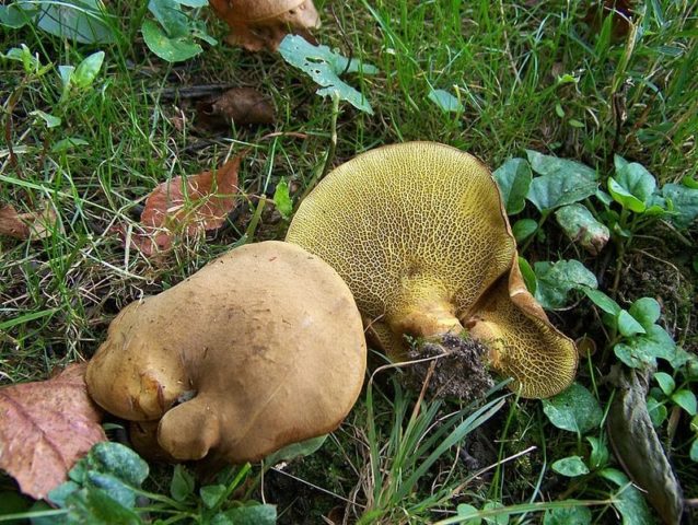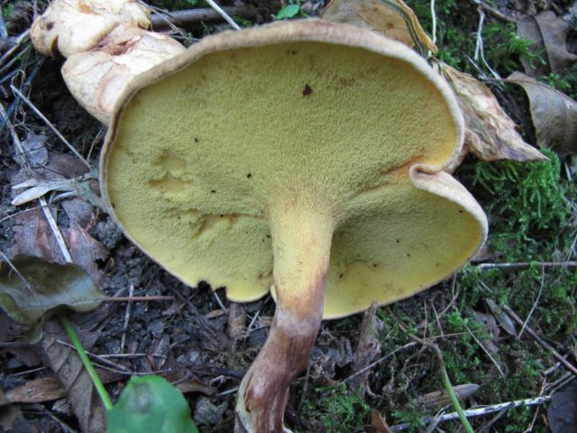 Die Rückseite der Kappe ist mit einer dünnen Schicht Hymenophor bedeckt, die aus dünnen und kurzen Röhrchen besteht, die zum Stiel hinabsteigen und zu diesem wachsen. Sie bilden große labyrinthische Poren, zuerst goldene und dann dunkle Oliven. Wenn Sie auf die Oberfläche des Hymenophors drücken, wird es blau oder grün und schließlich ganz braun.