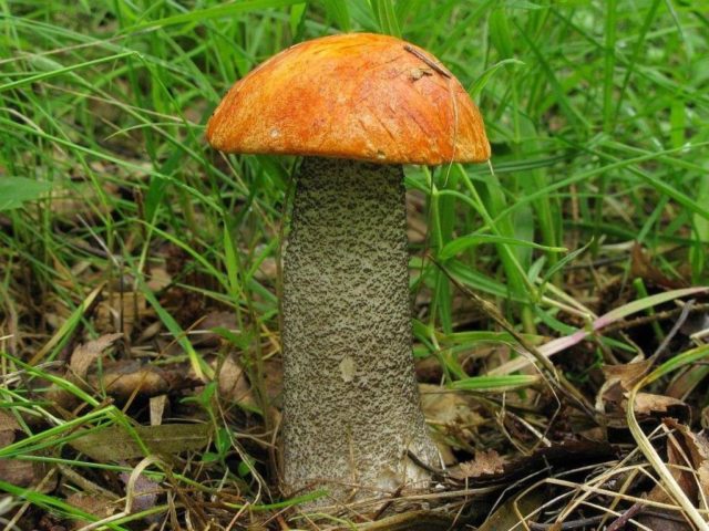 Roter oder orangefarbener Hut. Die Höhe des Beins beträgt bis zu 15 cm, die Dicke beträgt 1,5-3 cm. Der Durchmesser der Kappe beträgt 8-15 cm.