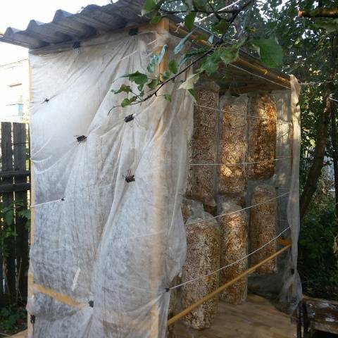 - Um die erforderliche Luftfeuchtigkeit aufrechtzuerhalten, wird das Myzel mit Stroh (bis zu 0,5 m) bedeckt.