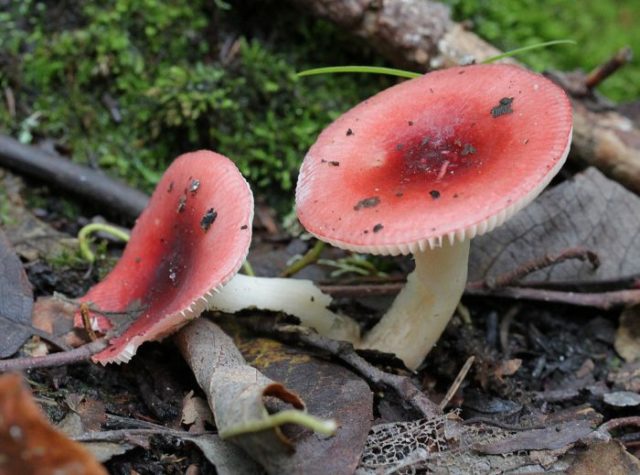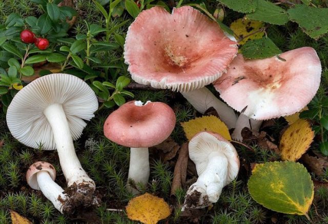 - Birke russula... Der obere Teil hat einen Durchmesser von bis zu 5 cm. Die Struktur des Fruchtfleisches ist spröde und fleischig. Gerippte Kante. Die Oberflächenfarbe ist hellrot, blassrosa. Es hängt alles vom Ort des Wachstums ab. Das Peeling ist leicht zu schälen. Das Bein ist weiß, manchmal ist ein gelber Farbton sichtbar. Seine Oberfläche ist faltig, verdickt sich nach unten. Das Fruchtfleisch des Pilzes schmeckt bitter. Es riecht nicht. Oft in Fichten- und Birkenwäldern zu finden.