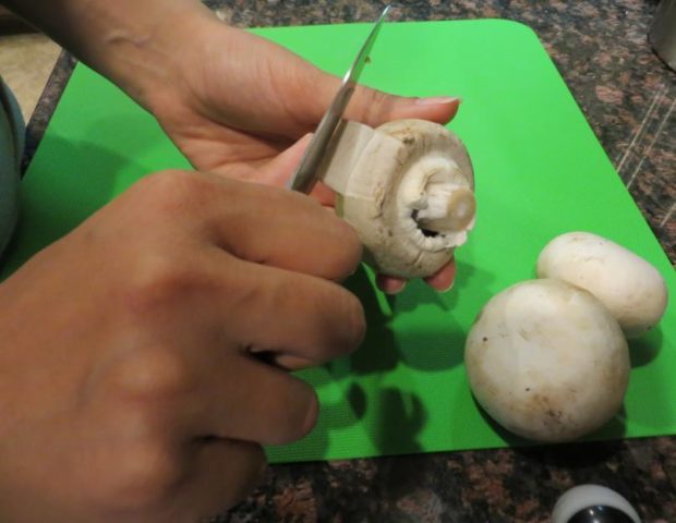 Pilzkappen müssen geschält werden, bevor sie zum Braten in den Ofen geschickt werden. Ein Foto der schrittweisen Reinigung von Champignons vor dem Kochen schlägt den folgenden Algorithmus vor:
