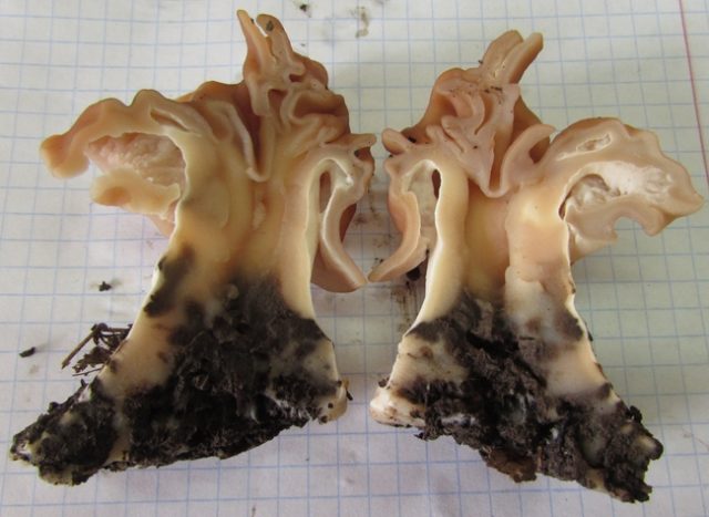 Die Oberfläche der Kappe ist grob gewellt, gefaltet und besteht aus mehreren Platten, die nach oben gebogen sind und 2-4 Lappen bilden, die ungleichmäßig gefaltet sind. Ihre scharfen Ecken sind zum Himmel gerichtet und die unteren Ränder lehnen sich gegen das Bein.