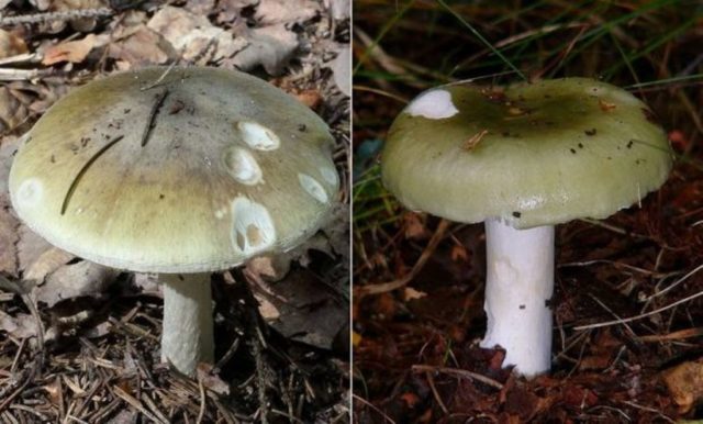 Die zweite "giftige grüne Russula" ist der Fliegenpilz. Die skalierte Sorte wird trotz des Fehlens der charakteristischen Kappe und der weißen Flecken damit verwechselt. Aber in der Russula haften die Schuppen fest an der Kappe, und im Fliegenpilz lösen sie sich leicht ab.