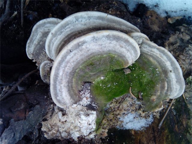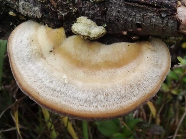 In jährlichen Fruchtkörpern sind freitragende Kappen sitzend, halbkreisförmig oder fast gerundet, 3-20 cm breit. Polyporen wachsen einzeln oder in kleinen Familien, sind mit einer breiten Basis am Holz befestigt, es gibt keine Beine. Zunderpilze werden bis zu 6,5 cm dick. Die flachen Kappen sind aufgrund des an der Basis aufsteigenden Tuberkels buckelig. Junge Haut ist samtig, weiß oder grau. Dann werden verschiedenfarbige, aber dunklere konzentrische Streifen von Oliv- bis Brauntönen gebildet. Während der Zunderpilz wächst, wird die Haut ohne Pubertät von verschiedenen cremig-ockerfarbenen Tönen glatt.