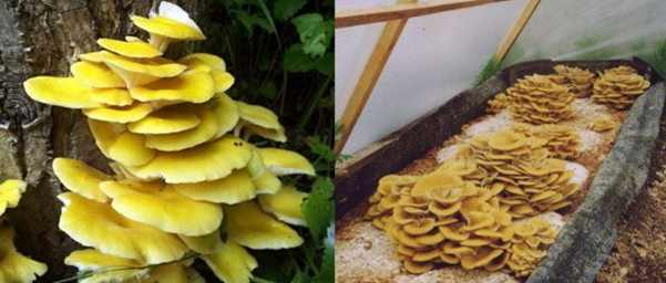 - Zitronenausternpilz hat eine leuchtend gelbe Farbe. Im Fernen Osten verteilt. In freier Wildbahn ist es häufiger auf der Ulme zu finden. Daher kam der zweite Name - Ilm Austernpilz. Häuser können auf einem Substrat oder einem Block aus Pappel, Espe oder Birke wachsen.