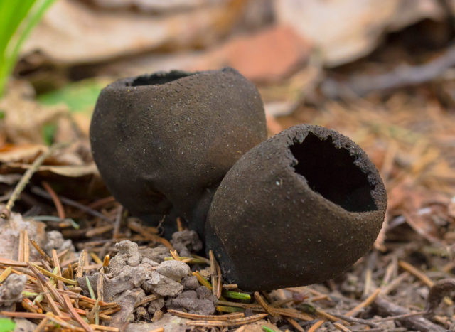 Dieser Pilz ist im Wald unauffällig, daher ist es nicht so einfach, ihn im Gras zu sehen. Dies liegt an der Tatsache, dass diese Art einen dunkelgrauen, fast schwarzen Farbton des Fruchtkörpers hat, der vor dem Hintergrund vergilbter Blätter verloren geht. Darüber hinaus zeichnet es sich durch seine geringe Größe aus und erreicht eine Höhe von nicht mehr als 10 cm.