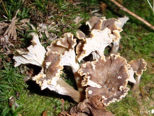 - Pfifferling grau (Cantharellus cinereus). Eine Besonderheit ist das gefaltete Hymenium auf der Rückseite des Trichters. Das Fruchtfleisch ist gummiartig-faserig. Der Schatten des Fruchtkörpers ist aschfahl. Es gehört zur Kategorie der Speisepilze, hat aber keinen hohen Geschmack.