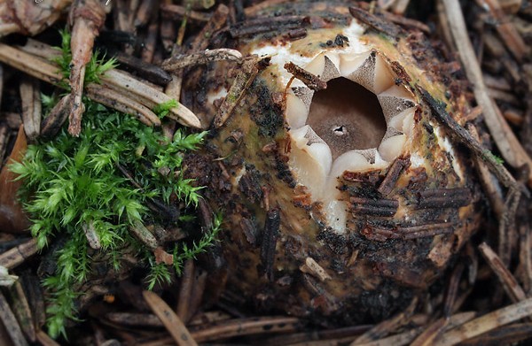 Der gesäumte Seestern oder das Sitzen ist ein Pilz der Familie Zvezdovikov. Der Name kommt von den lateinischen Wörtern "Erde" und "Stern". Es ähnelt einem Ei oder einer Kugel mit einem Durchmesser von 1 bis 4 cm, die sich auf den "Blütenblättern" befindet. Die Oberfläche ist mit gelblichem Myzel bedeckt.