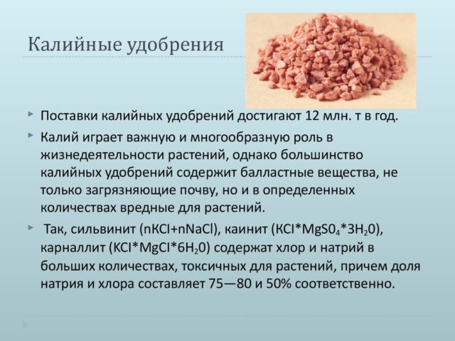 Es ist ebenfalls nicht wünschenswert, Kalium in seiner reinen Form zuzusetzen. Normalerweise kaufen sie einen vorgefertigten Komplex, der diesen Dünger enthält, oder stellen die erforderliche Zusammensetzung selbst her.