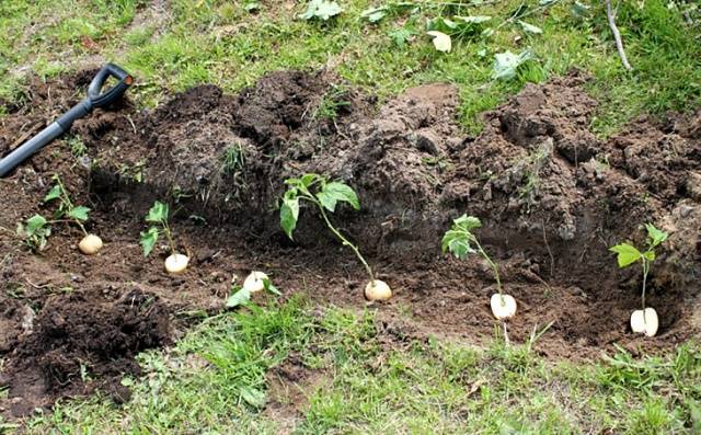 Die Wurzeln sind über die gesamte Oberfläche der Grube verteilt und mit nahrhafter Erde bestreut. Die Erde ist leicht gestampft und reichlich bis zum Schlamm bewässert. Dies erleichtert das Eindringen von Boden unter die Wurzeln. Wasser drückt überschüssige Luft heraus und das Wurzelsystem haftet besser am Boden.