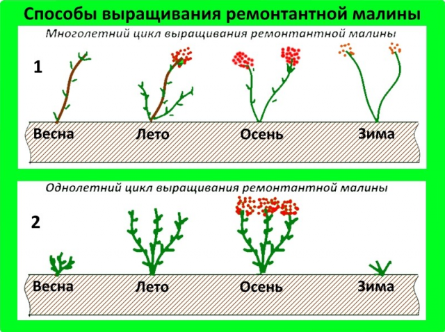 Einige Gärtner erledigen die ganze Arbeit auf die gleiche Weise wie beim Anbau herkömmlicher Sorten. Ein Stängel, der Früchte trägt, trocknet während der Winterkälte nicht aus. In diesem Fall die Himbeeren unmittelbar danach Überwinterung beginnt sich zu verzweigen und produziert bereits zu Beginn des Sommers Beeren. Während der Fruchtzeit wachsen neue Stängel, aus denen Sie im Herbst viele weitere köstliche Beeren sammeln können.