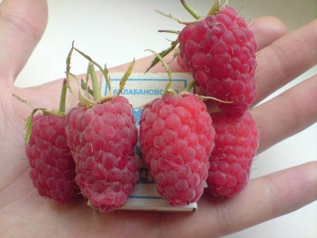 Der Name dieser Himbeersorte bezieht sich hauptsächlich auf Beeren. Sie können von einer Streichholzschachtel und mehr wirklich gigantisch groß sein. Die Masse einer Beere beträgt durchschnittlich 10-15 Gramm, und die ersten Beeren erreichen leicht 20-25 Gramm.
