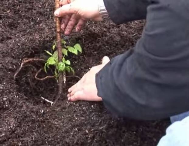 Vor dem Pflanzen wird jedem Loch oder Graben eine gute Handvoll Holzasche hinzugefügt. Jetzt wird der Sämling in die Mitte des Lochs gelegt, seine Wurzeln werden sorgfältig begradigt und die Himbeeren mit Erde bestreut. Es bleibt nur, die Sämlinge zu gießen und zu warten, bis sie Wurzeln schlagen.