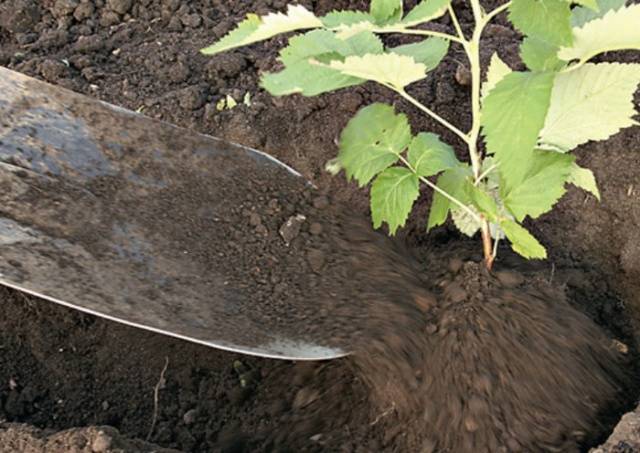 In der Mitte des Sitzes wird ein Hügel angelegt und Setzlinge darauf gepflanzt. Der Boden wird darauf gegossen und gut gestampft, um die Luft unter dem Himbeerwurzelsystem herauszudrücken. Durch reichliches Gießen haften die Wurzeln besser am Boden. Beim Pflanzen sollte der Wurzelkragen des Sämlings höher sein als der Boden. Nach dem Gießen setzt es sich etwas ab.