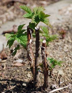 Nach dem Pflanzen müssen die Himbeeren regelmäßig gewässert werden, bis die Wurzeln Wurzeln schlagen und neue Triebe am Stiel erscheinen.