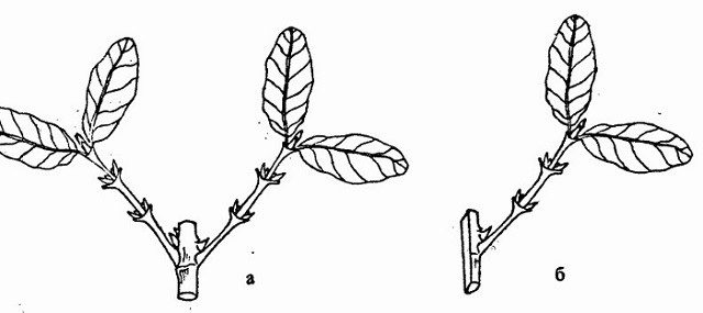 Bei geschnittenen grünen Zweigen bleibt nur der Mittelteil übrig. Der untere Schnitt wird in einem Winkel von 45 ° schräg gemacht, und der obere Schnitt wird gerade 1,5 cm höher von der Knospe gemacht. Das untere Blatt am Trieb wird entfernt und der Rest wird auf die Hälfte gekürzt.