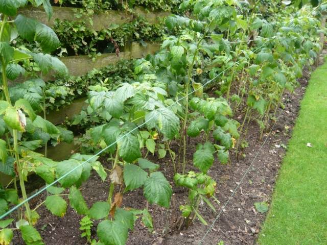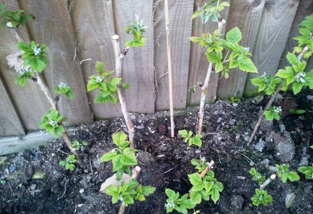 Himbeeren der Sorte Daughter of Hercules werden abgeschnitten, so dass nicht mehr als 6 Zweige übrig bleiben. Die restlichen Triebe sind gebunden. Es ist auch notwendig, den Boden regelmäßig zu lockern.