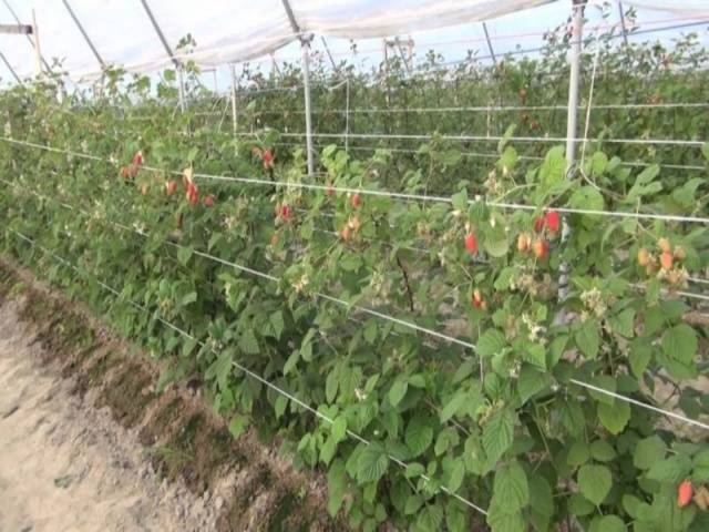 Dieser Strauch zeichnet sich durch starke Stängel aus. Aufgrund des Gewichts der Früchte können sie sich jedoch stark zum Boden neigen. Das Binden der Stängel erleichtert nicht nur die Ernte, sondern trägt auch zur besseren Belüftung der Büsche bei. Dank der gleichmäßigen Beleuchtung reifen die Beeren der Karamell-Himbeeren schneller und die Wahrscheinlichkeit, Pilzinfektionen zu entwickeln, nimmt ab.