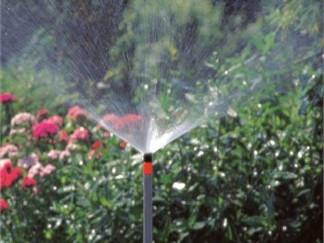- Streuen - bezieht sich auf die beliebtesten, insbesondere in Bereichen mit instabiler Feuchtigkeit. Wasser spritzt als Regen über den Boden und Himbeersträucher. Die Pfosten sind zwischen den Reihen befestigt und die Sprühgeräte müssen sich über dem Erntegut befinden.Vorteile der Methode: Auf dem Boden bilden sich keine Kanäle und Furchen, die Erde wird gleichmäßig angefeuchtet (was besonders in Gebieten mit schwierigem Gelände wichtig ist), die Struktur der Erde wird nicht zerstört, Staub wird von den Blättern und ihren abgewaschen Atmung verbessert sich. Bei bewölktem Wetter kann Karamell zu jeder Tageszeit gegossen werden. Und an heißen, sonnigen Tagen ist es ratsam, die Himbeersträucher abends zu bewässern. Bei dieser Bewässerungsmethode ist es wichtig, die richtige Übereinstimmung zwischen der Intensität des Regens und der Geschwindigkeit zu finden, mit der Wasser in den Boden aufgenommen wird. Die Nachteile umfassen eine Verschlechterung der Bewässerungsqualität bei starkem Wind oder eine Abnahme des Wasserdrucks im System;