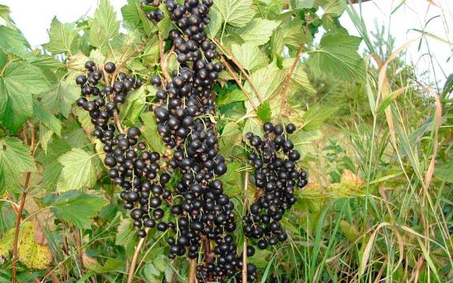 Eine mittelreife schwarze Johannisbeersorte namens Green Haze mit hohen Erträgen. Auf dem Foto sehen Sie einen kleinen Busch, der während der Fruchtzeit mit großen Beeren bedeckt ist.