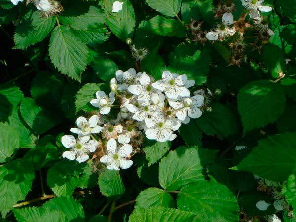 - Himbeerblüten - klein (ca. 1 cm Durchmesser) weiß, fünfblättrig, mit vielen Staubblättern, in kleinen Büscheln gesammelt, bestäubt von Bienen, die Nektar von ihnen sammeln, Blüte beginnt im Mai oder Juni;
