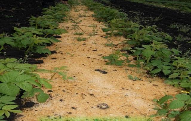 Eine wunderbare Möglichkeit, die optimale Feuchtigkeit in Himbeerpflanzungen aufrechtzuerhalten, ist das Mulchen der Büsche. Im Herbst kann nach dem Trimmen der Triebe mit einer 10 cm hohen Schicht Humus oder verfaultem Sägemehl gemulcht werden. Im Frühjahr dient diese Mulchschicht als zusätzliche Nährstoffquelle für Himbeeren. Darüber hinaus muss die Mulchschicht bis zum Sommer vergrößert werden. An heißen Tagen hilft dies, die Feuchtigkeit an den Pflanzenwurzeln zu halten.