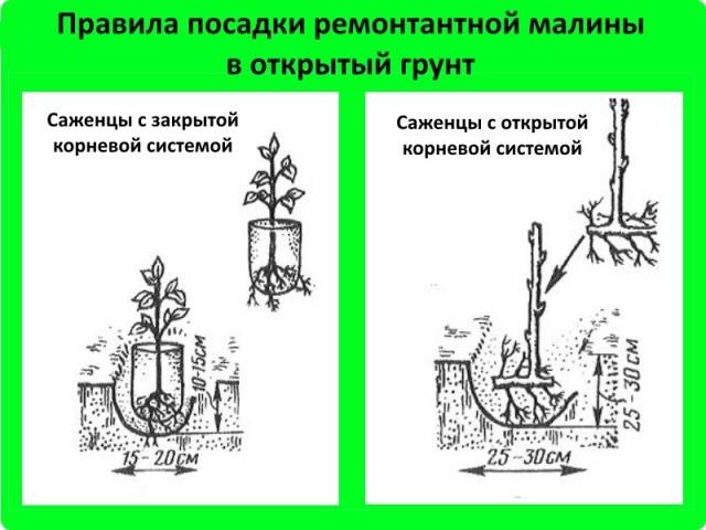 Die Pflanztechnik selbst unterscheidet sich nicht grundlegend vom Pflanzen gewöhnlicher Himbeeren. Büsche können entweder in Gräben oder in Löchern gepflanzt werden. Es ist wichtig, dass die Pflanztiefe genau der entspricht, bei der die Pflanze zuvor gewachsen ist. Sowohl eine Vertiefung als auch eine hohe Pflanzung beeinträchtigen die weitere Entwicklung der Sämlinge. Nach dem Pflanzen müssen die Sämlinge mit etwa 10 Litern Wasser pro Busch gut abgeworfen werden.